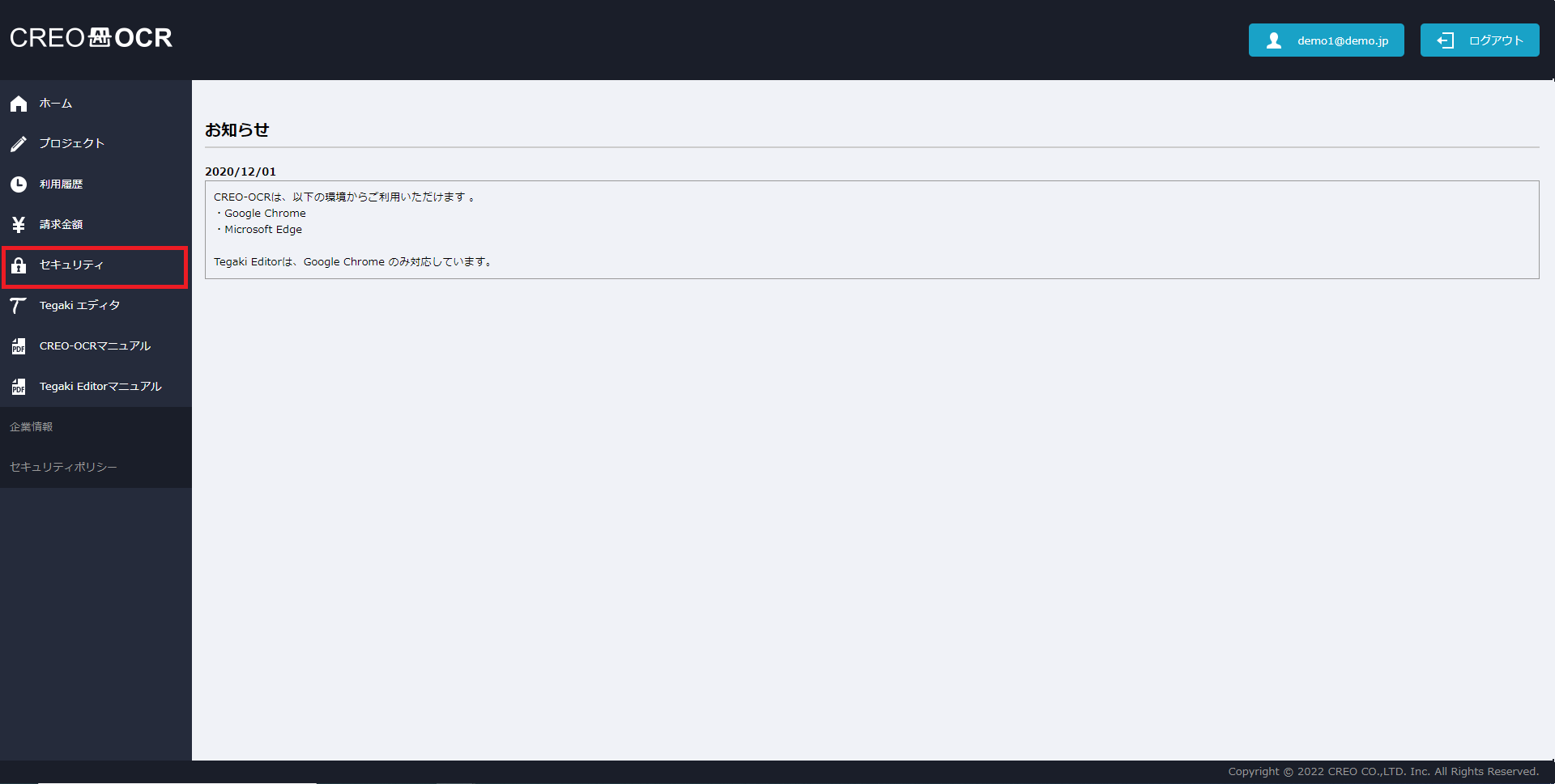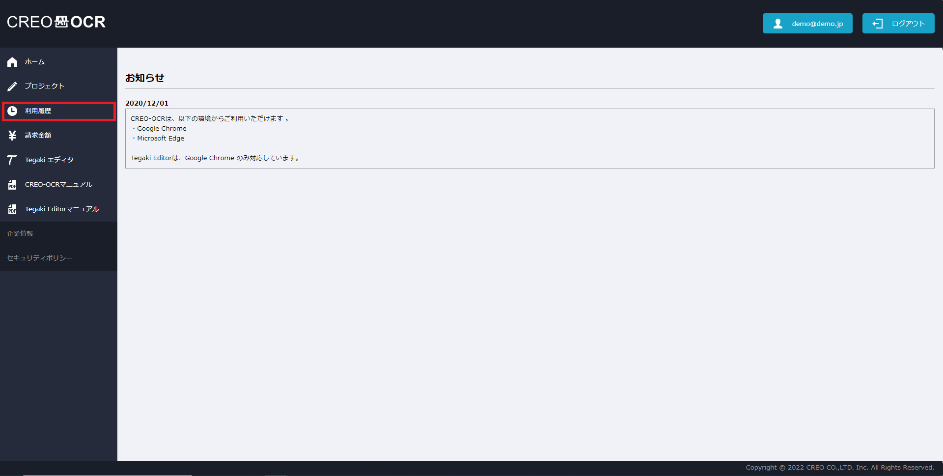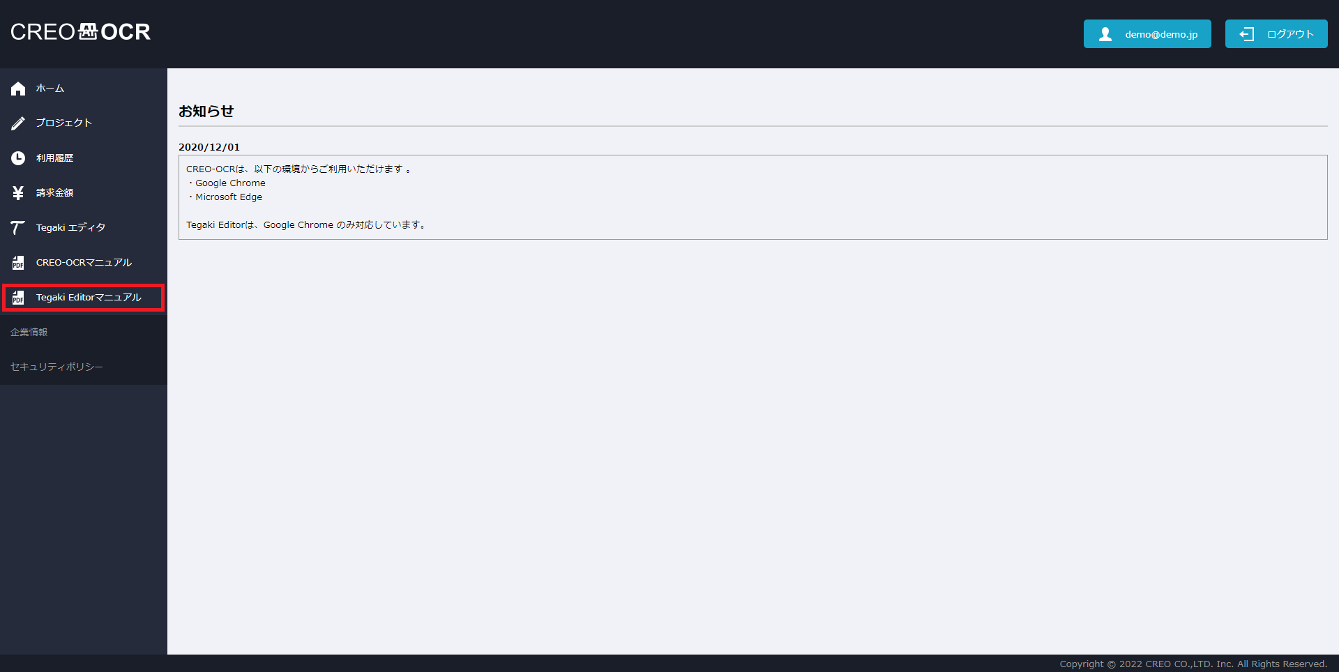 「Tegaki Editorマニュアル」はCREO-OCRのメニューよりご利用いただけます。