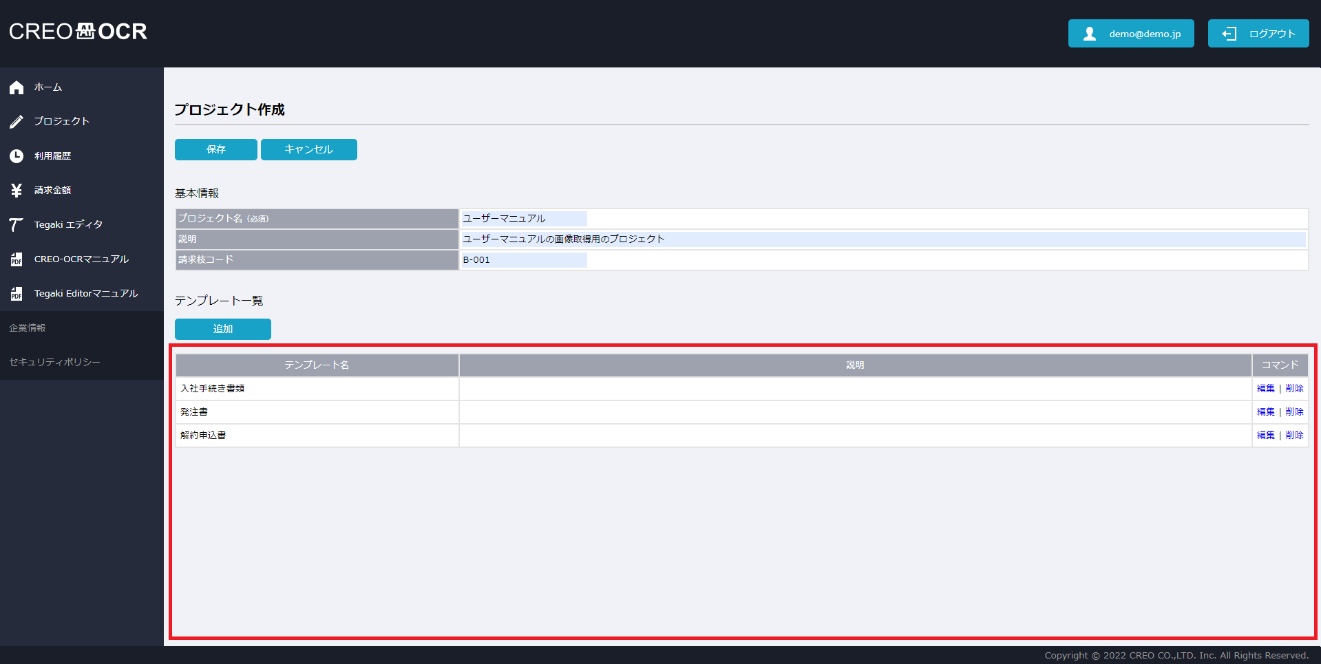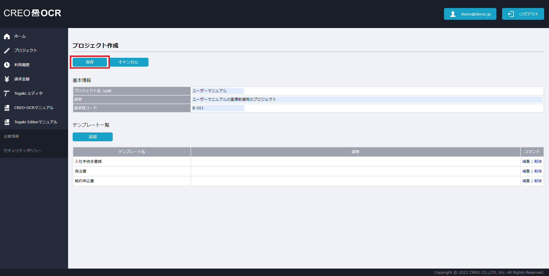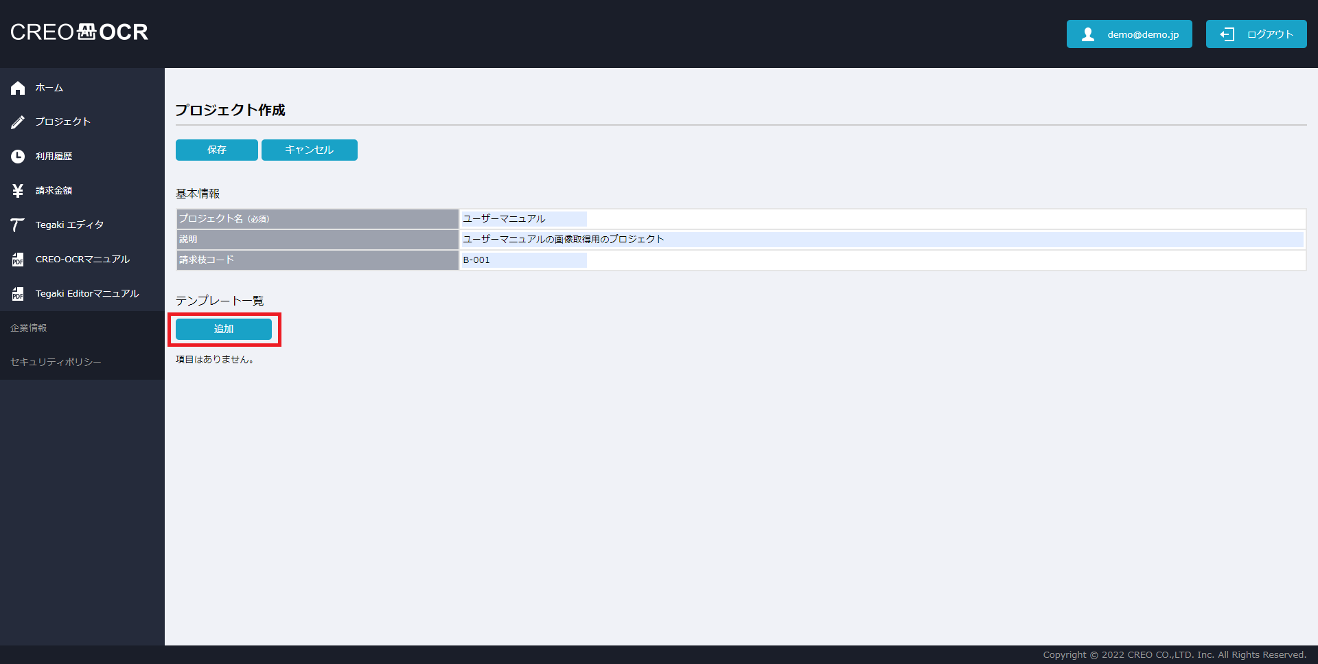 項目名 説明 プロジェクト名 プロジェクトの名称です。任意の値を入力してください。 説明 プロジェクトの説明です。任意の値を入力してください。 請求枝コード 請求金額画面で請求枝コード毎の料金を確認したい場合は、任意の値を入力してください。 テンプレート名 テンプレートの名前を設定してください。 説明 テンプレートの説明です。任意の値を入力してください。 - 保存をクリックします。