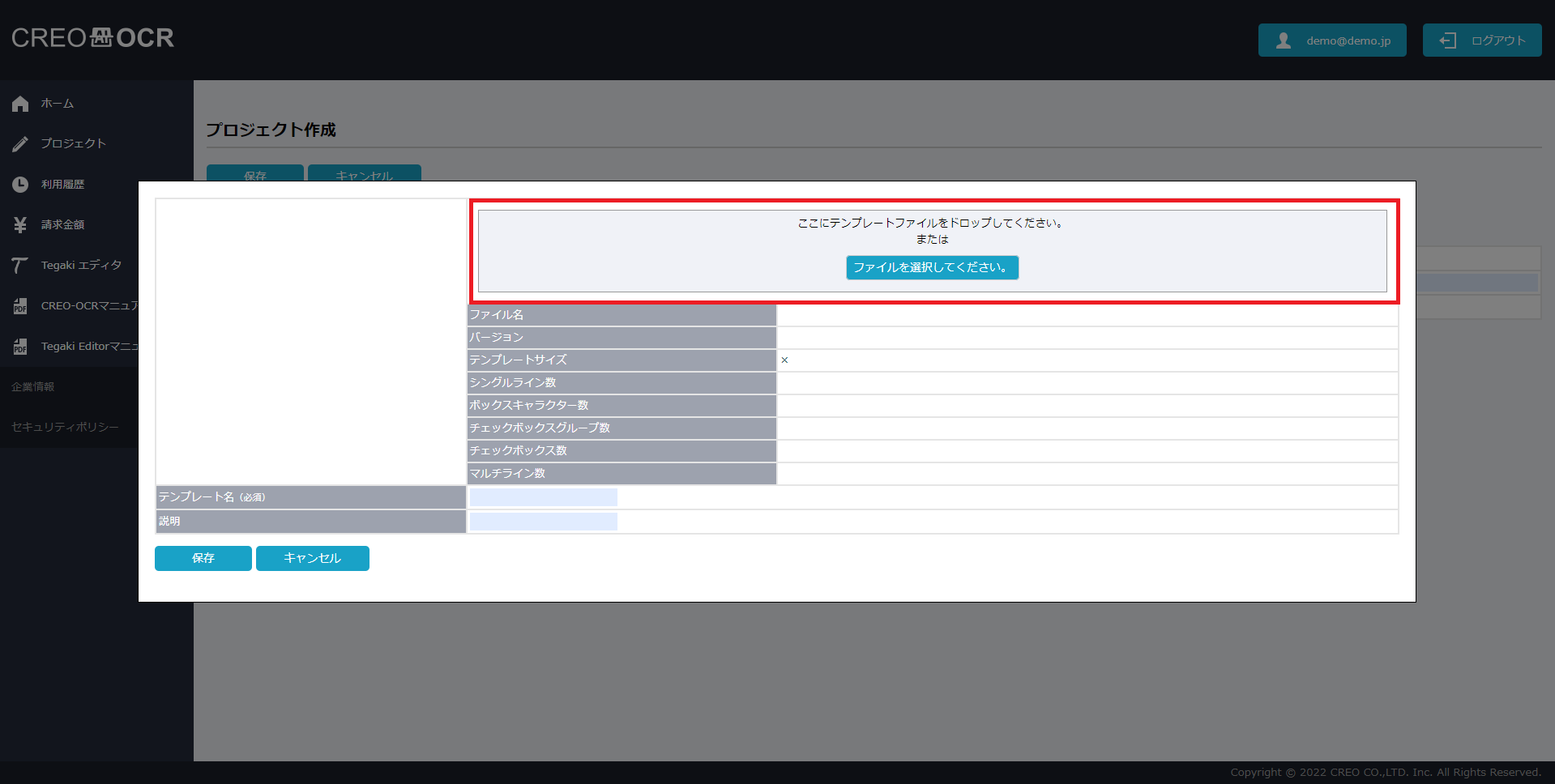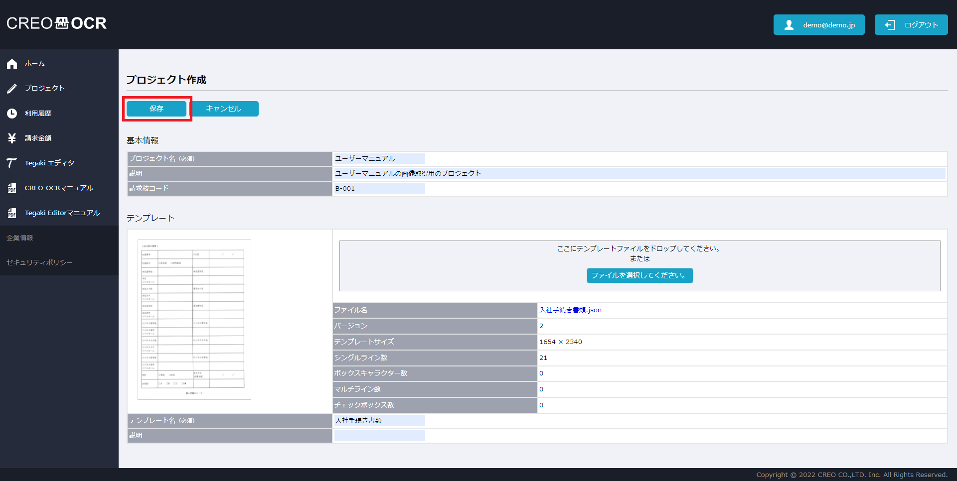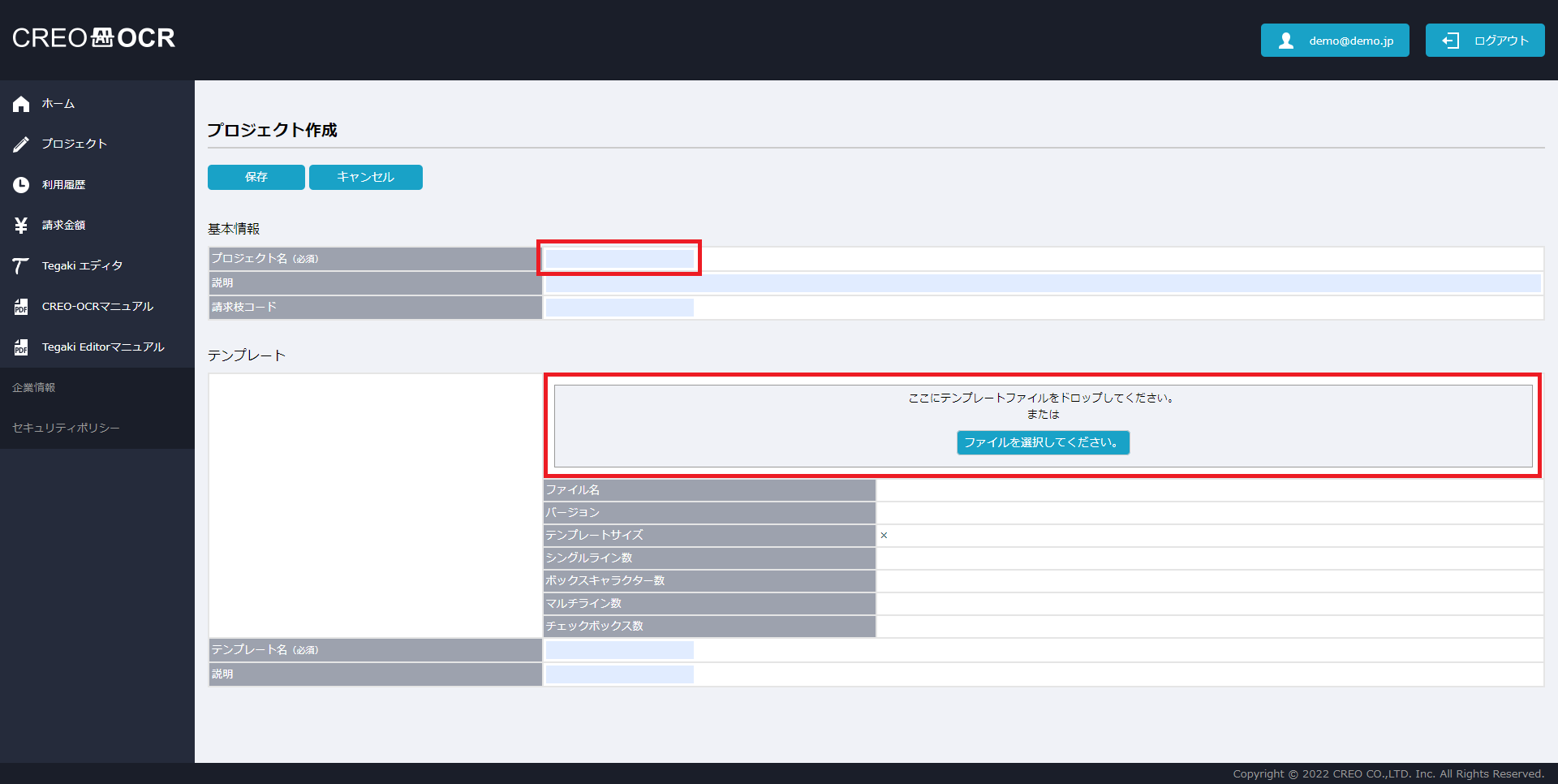 項目名 説明 プロジェクト名 プロジェクトの名称です。任意の値を入力してください。 説明 プロジェクトの説明です。任意の値を入力してください。 請求枝コード 請求金額画面で請求枝コード毎の料金を確認したい場合は、任意の値を入力してください。 テンプレート名 テンプレートの名前を設定してください。 説明 テンプレートの説明です。任意の値を入力してください。 - 保存をクリックします。
