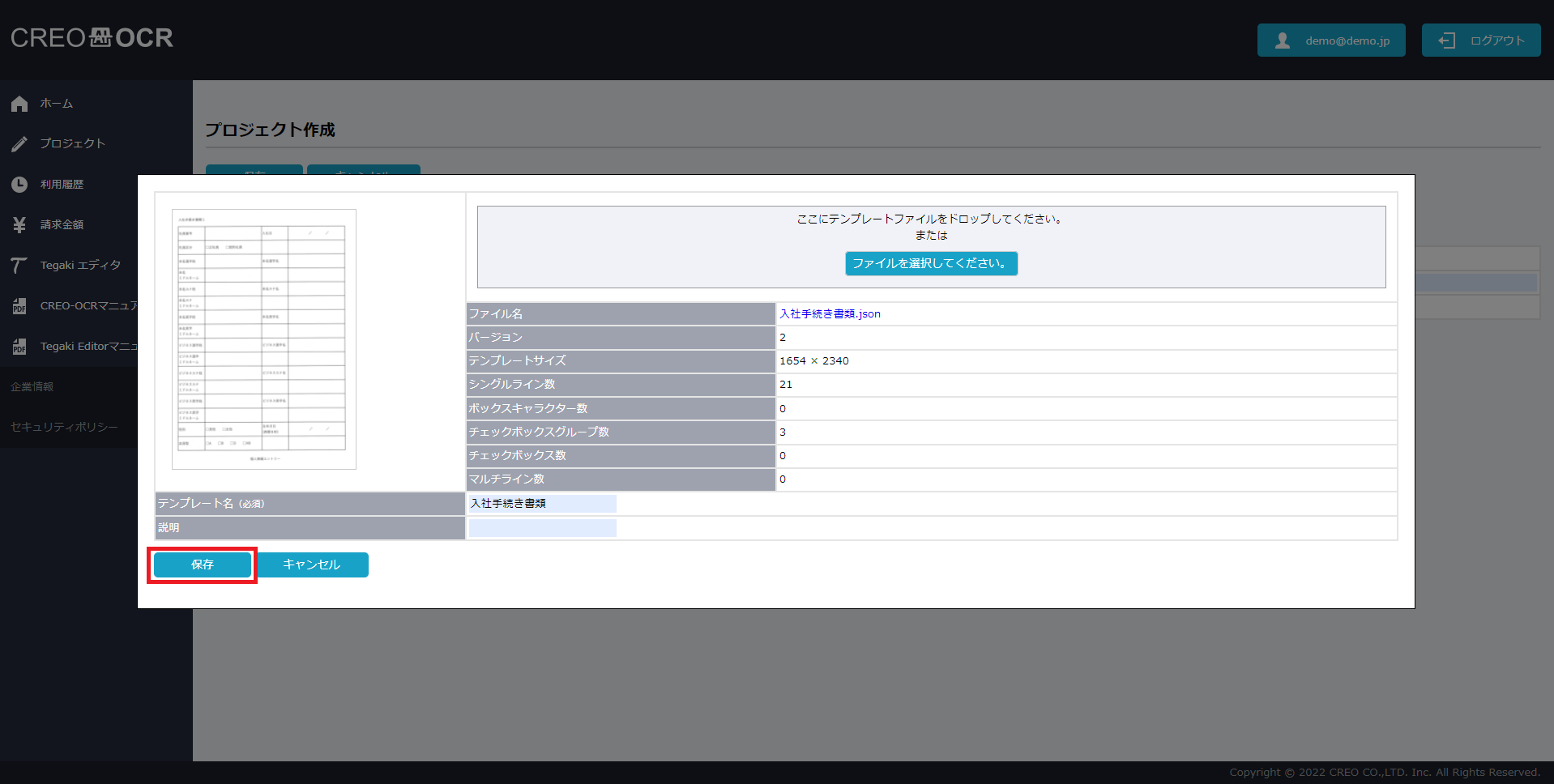 ※ファイルを選択すると自動で設定されますので、必要に応じ変更してください。説明 テンプレートの説明です。任意の値を入力してください。 - 保存をクリックします。