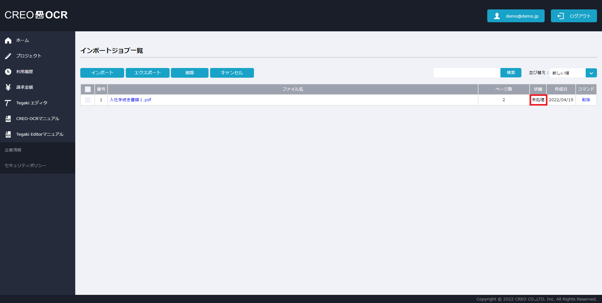 - インポートの処理状況は状態欄で確認できます。