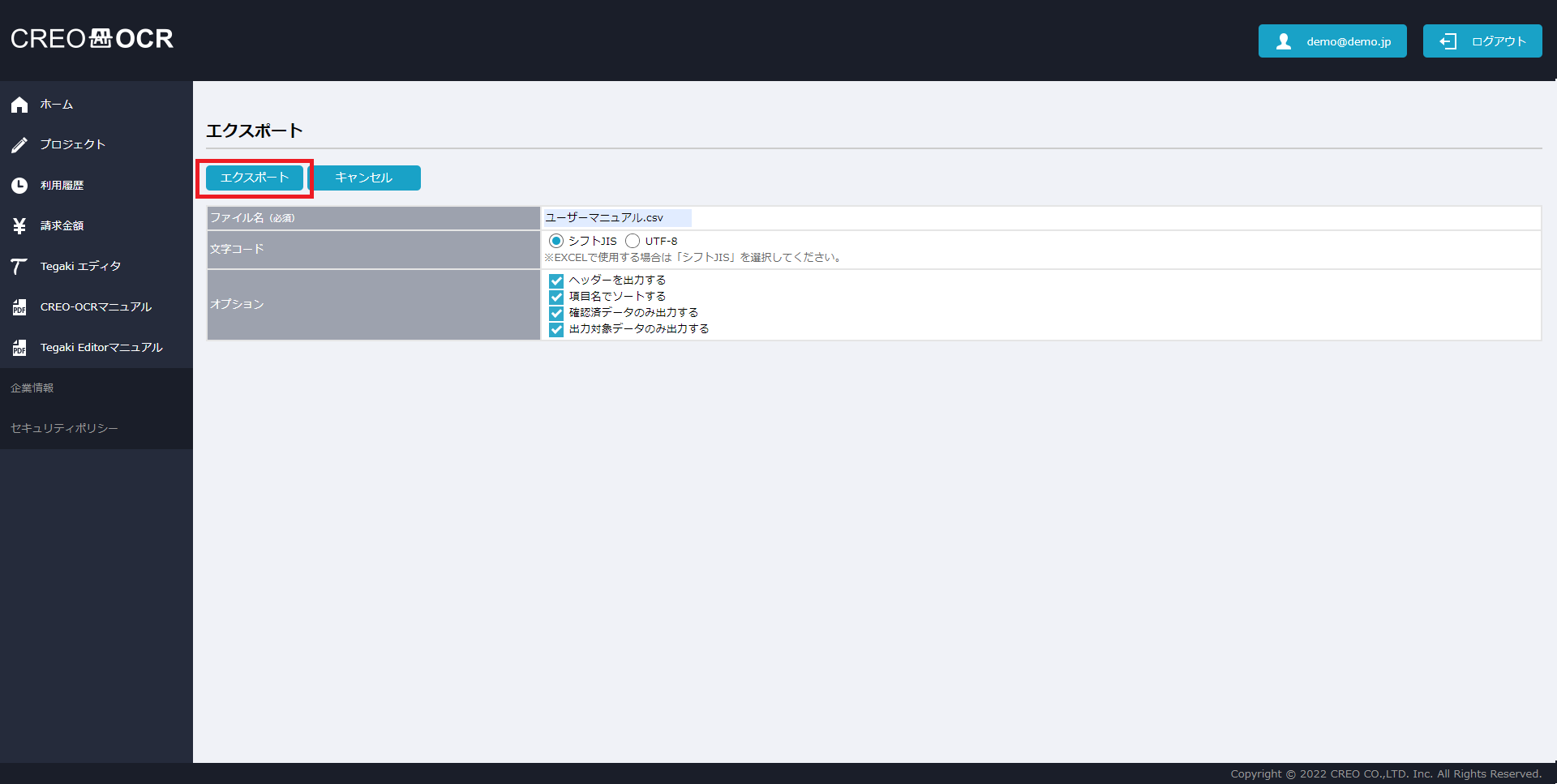 項目名 説明 ファイル名 CSVとして出力したいファイル名を設定してください。 文字コード 文字コードを選択してください。EXCELで使用する場合は「シフトJIS」を選択してください。 ヘッダーを出力する ヘッダーを出力したい場合はチェックしてください。 項目名でソートする 項目名でソートしたい場合はチェックしてください。 確認済データのみ出力する 確認済データのみ出力したい場合はチェックしてください。 出力対象データのみ出力する 出力対象データのみ出力したい場合はチェックしてください。 - エクスポートをクリックしますとCSVファイルがダウンロードされます。