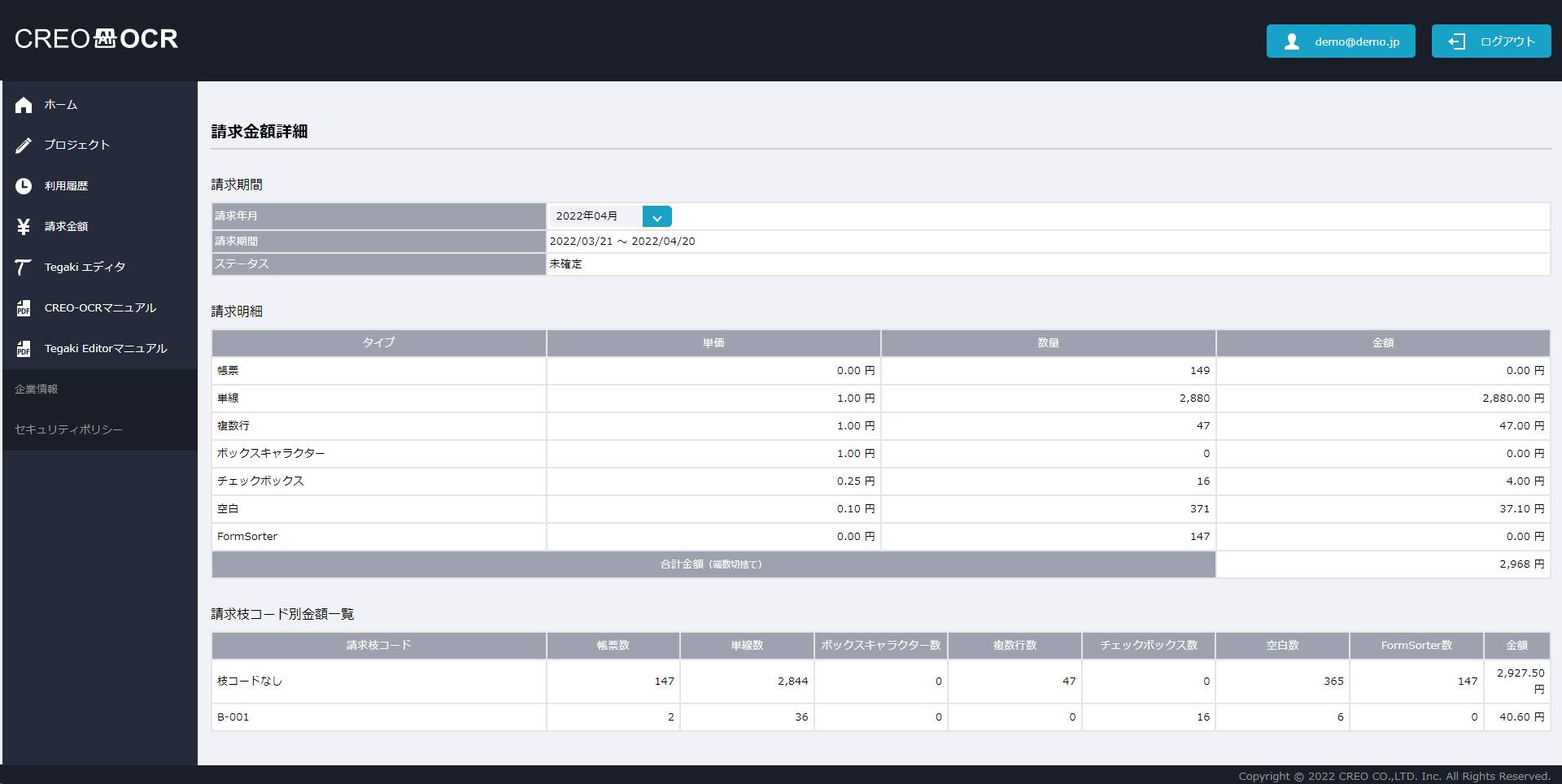 - 月ごとの請求金額が確認できます。プロジェクトに請求枝コードを設定している場合は、請求枝コード別の金額を確認することもできます。