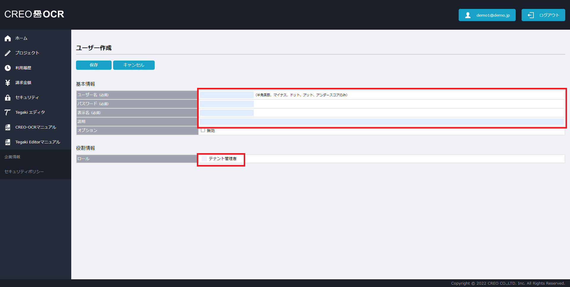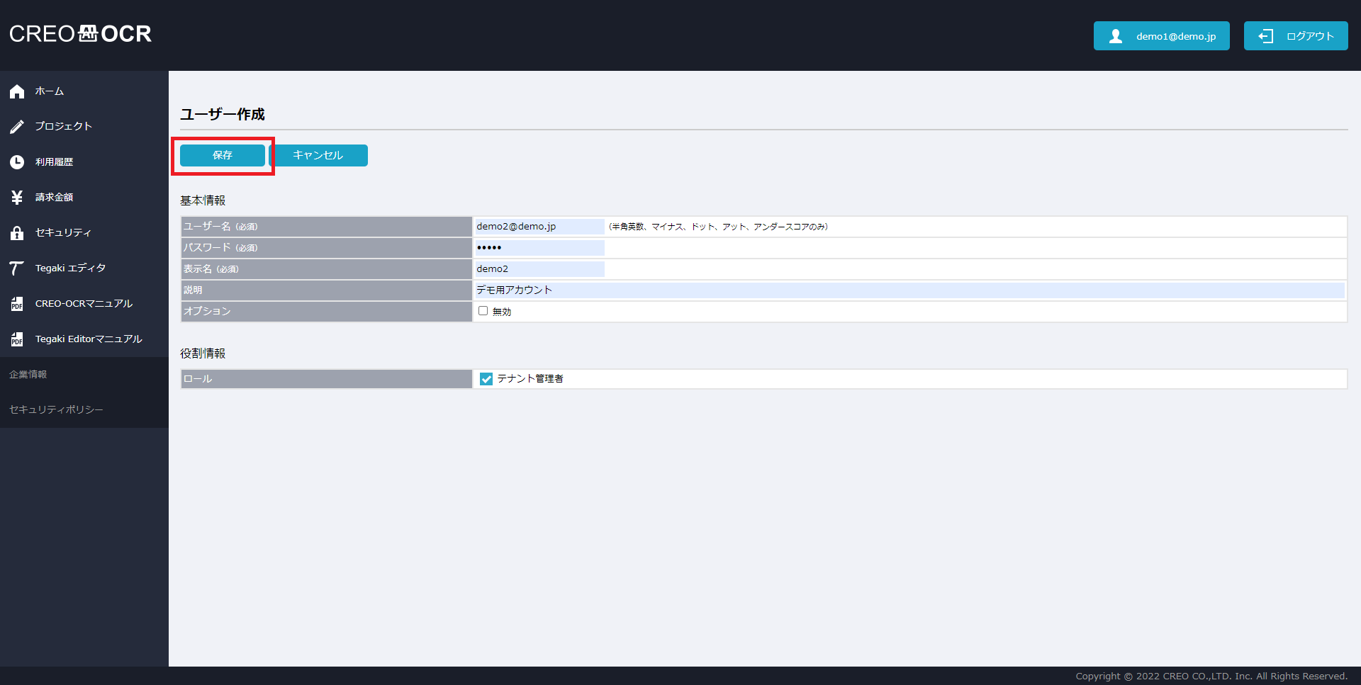 ※通常、新規作成時にはチェックは入れません。作成済みのユーザーの利用を一時停止させたい際などにチェックを入れます。ロール テナント管理者とする場合は、チェックを入れてください。 -