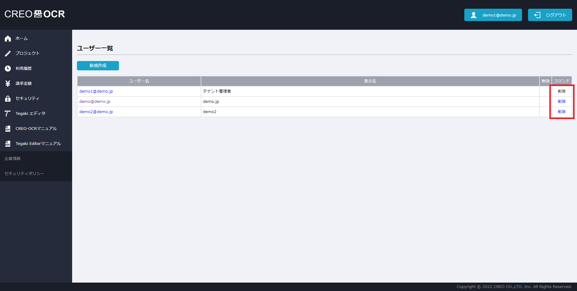 - ユーザーの作成と削除ができます。